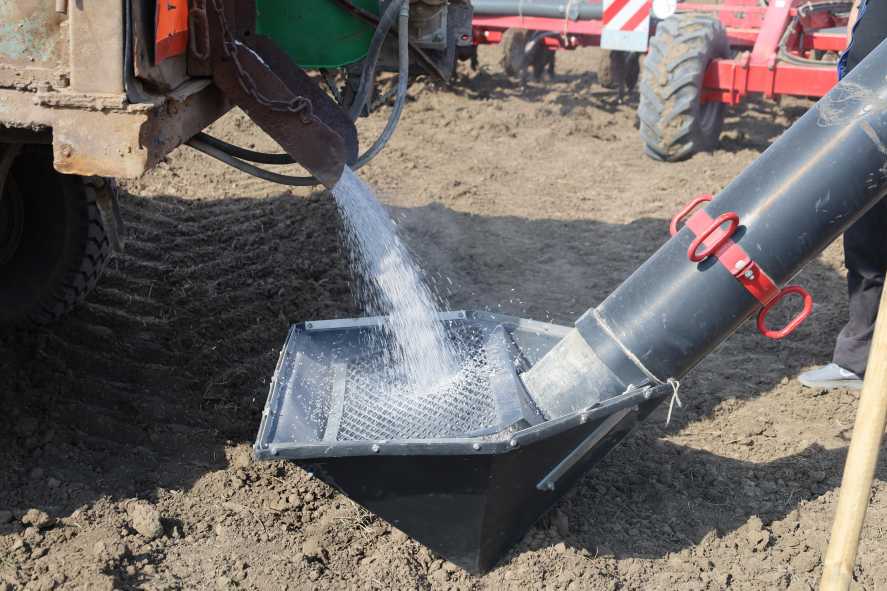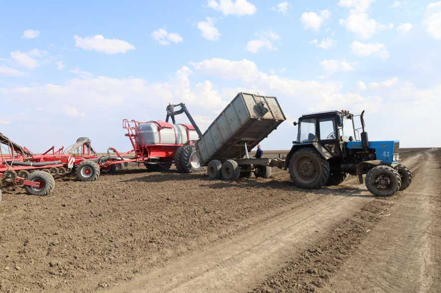 В этот момент в бункеры сельхозтехники наполнялись подвезенными на поле минеральными удобрениями.