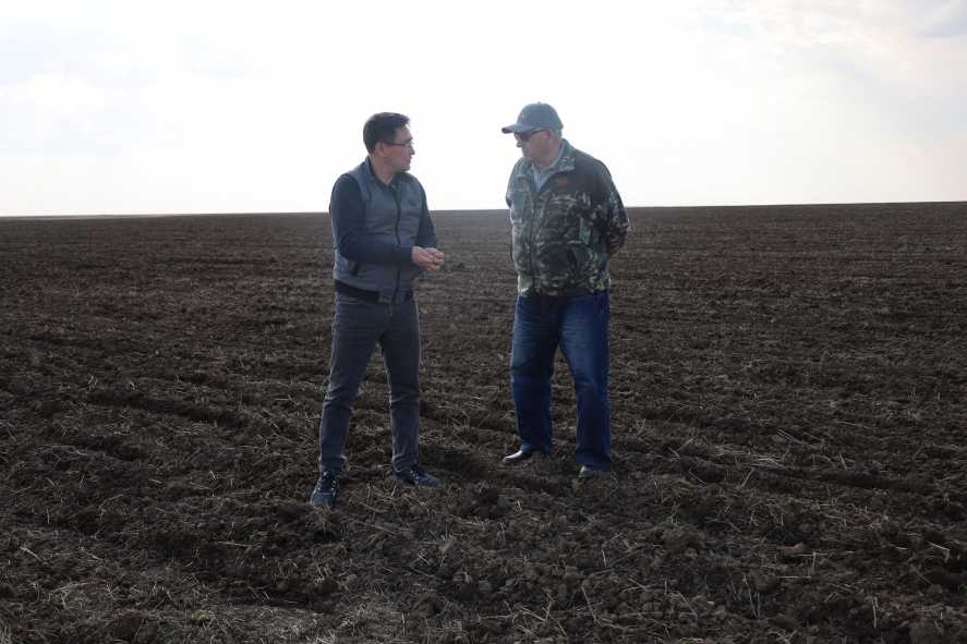 Знакомство с работниками ТОО «Алтынсарино» продолжилось на полях. Герой труда Казахстана Борис Князев рассказал о технологии внесения минеральных удобрений.