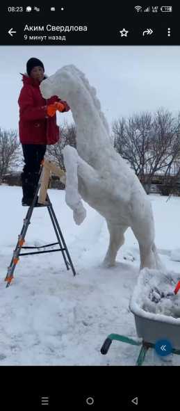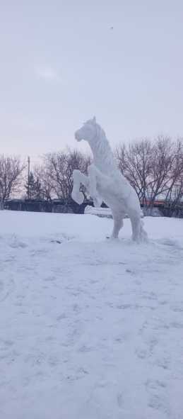 Аппақ қардан жасалған мына мүсіндер қандай көркем десеңізші! Құдды, бір шынайы тұлпар ма дерсіз. Бұл тамаша туындылардың авторы Юнир Шарипкул есімді азамат. Бүгінде ауыл жұртының қызыға тамашалап, суретке түсетін сүйікті орнына айналған мүсіннің жасалу тарихын авторынан сұрап білдік.