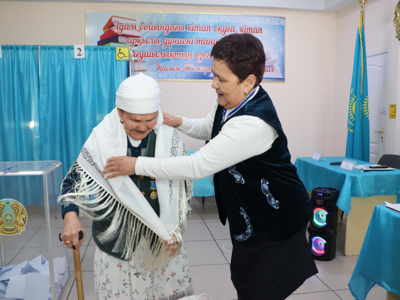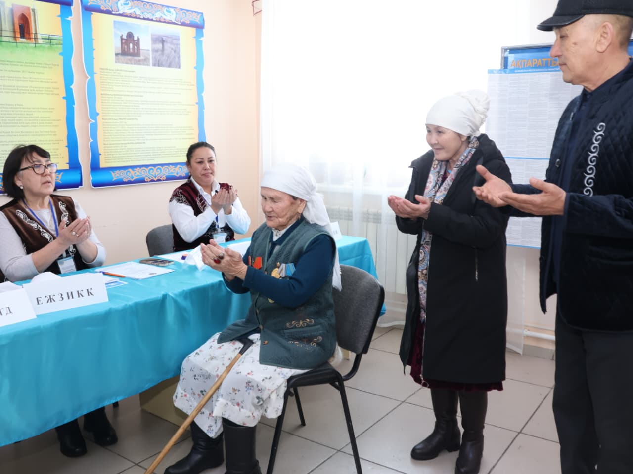 Өз кезегінде №654 референдум учаскесінің комиссия төрайымы Гүлнар Ақсаутова кейуананың белсенділігіне алғыс білдіріп, иығына ақ жаулық жауып, құрмет көрсетті.