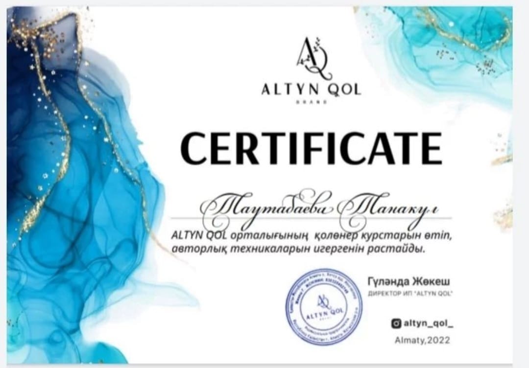 2020 жылы Алматы қаласында «Алтын қол» қолөнер курсынан өтіп, моншақтан түрлі бұйымдар жасауды үйренді. Кейін макраме жіптерін пайдаланып, бала тербететін әсем әткеншек те тоқып шығарды. Айта берсең, жасаған дүниелері көп. Қолөнерге арналған жіптерді арнайы Алматы қаласынан алдырып тұрады.