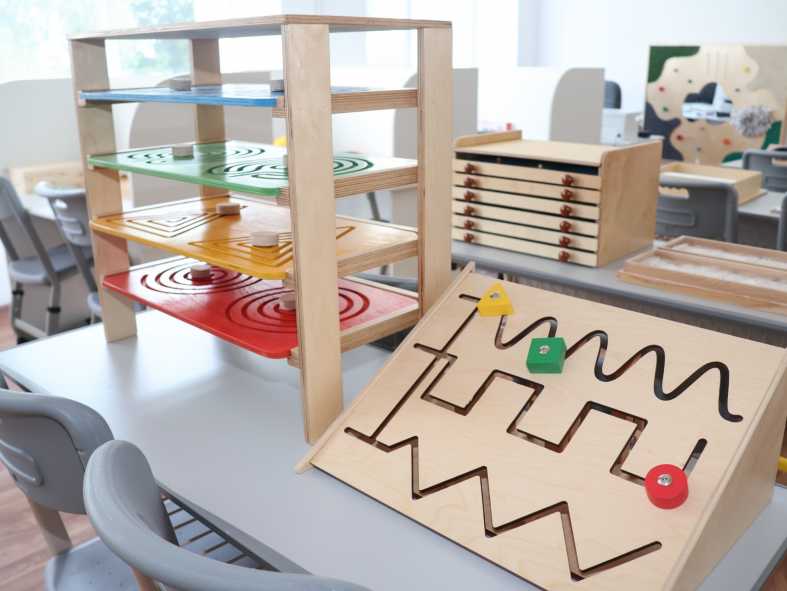 Кабинет оснащен современными сенсорными и развивающими средствами. Среди них – настенные модули для развития моторики кистей рук, фиброоптическая и акустическая тактильные панели, панели с декоративными элементами, сенсорный модуль с геометрическими телами и зеркалом, модули для развития мелкой моторики, массажные коврики и деревянные дорожки, дидактические лабиринты, а также геометрический комод.