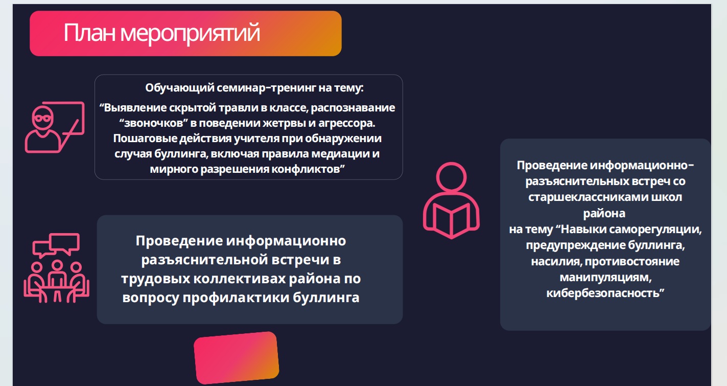 Во время семинара психолог разберет такие темы, как выявление скрытой травли в классе, распознавание «звоночков» в поведении жертвы и агрессора, пошаговые действия при обнаружении буллинга, включая правила медиации и мирного разрешения конфликта.