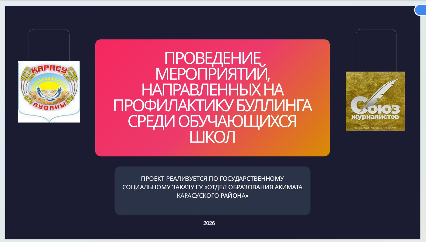 Материал подготовлен в рамках проекта «Проведение мероприятий, направленных на профилактику буллинга среди учащихся школ», реализуемого областным Союзом журналистов по заказу отдела образования акимата Карасуского района.