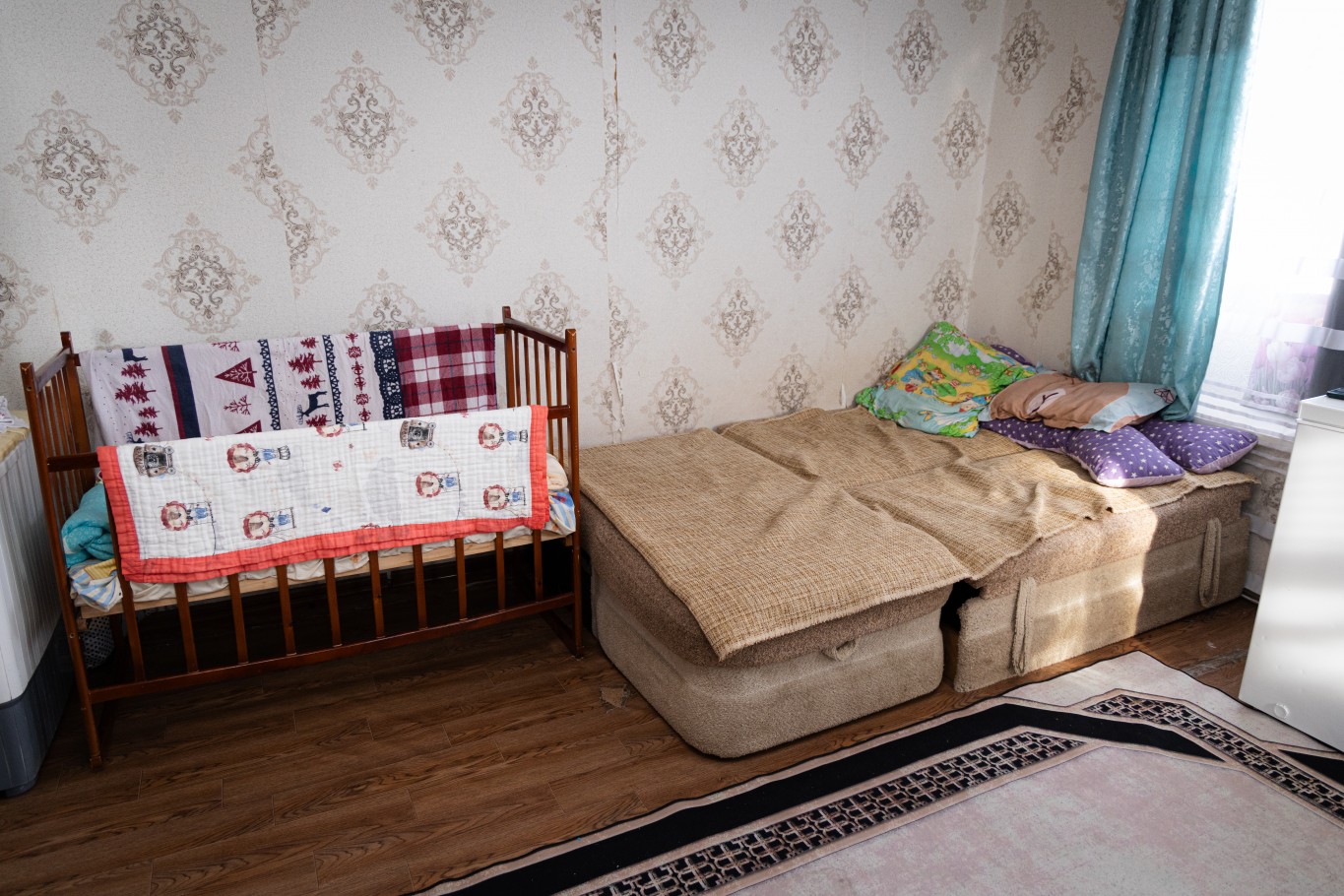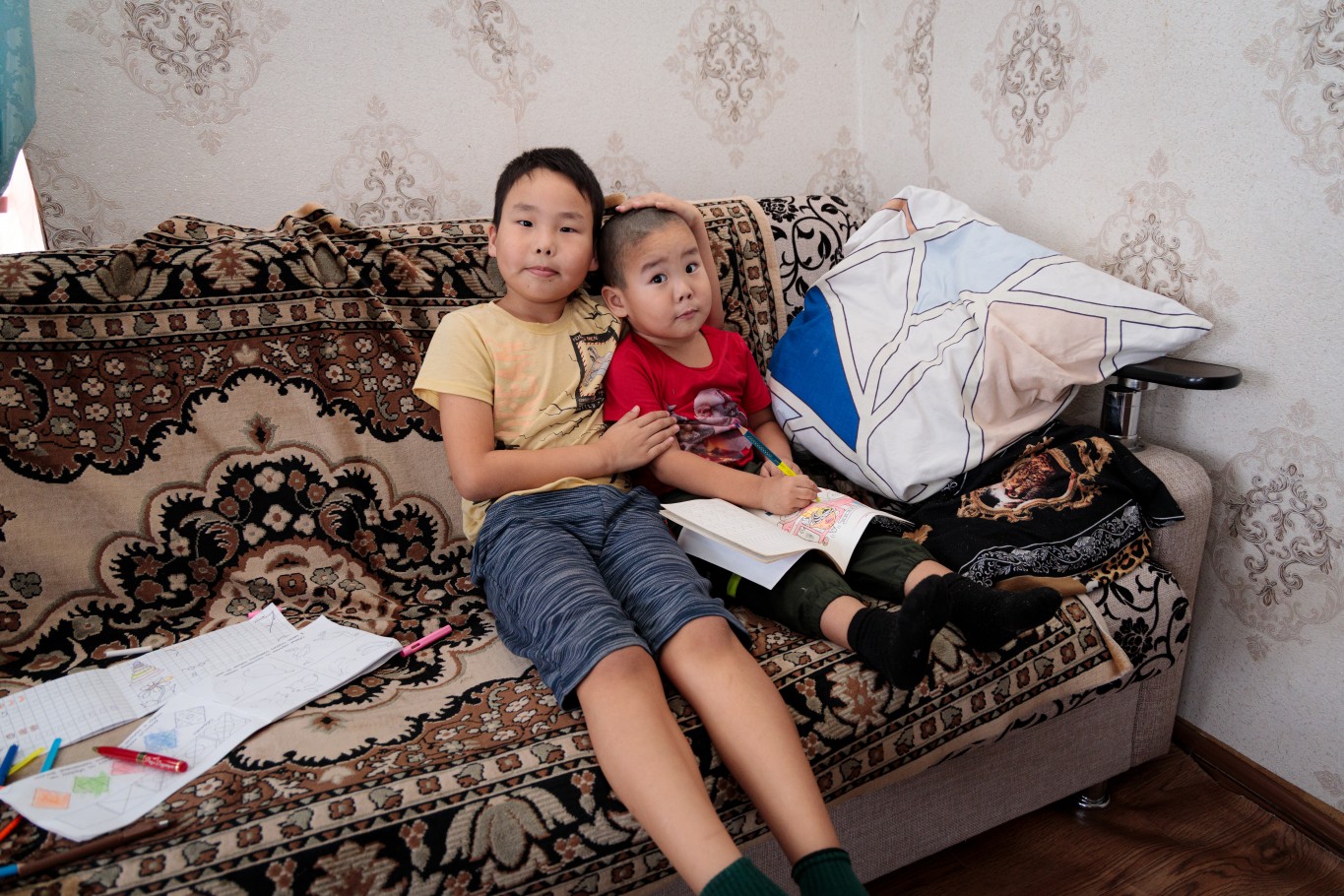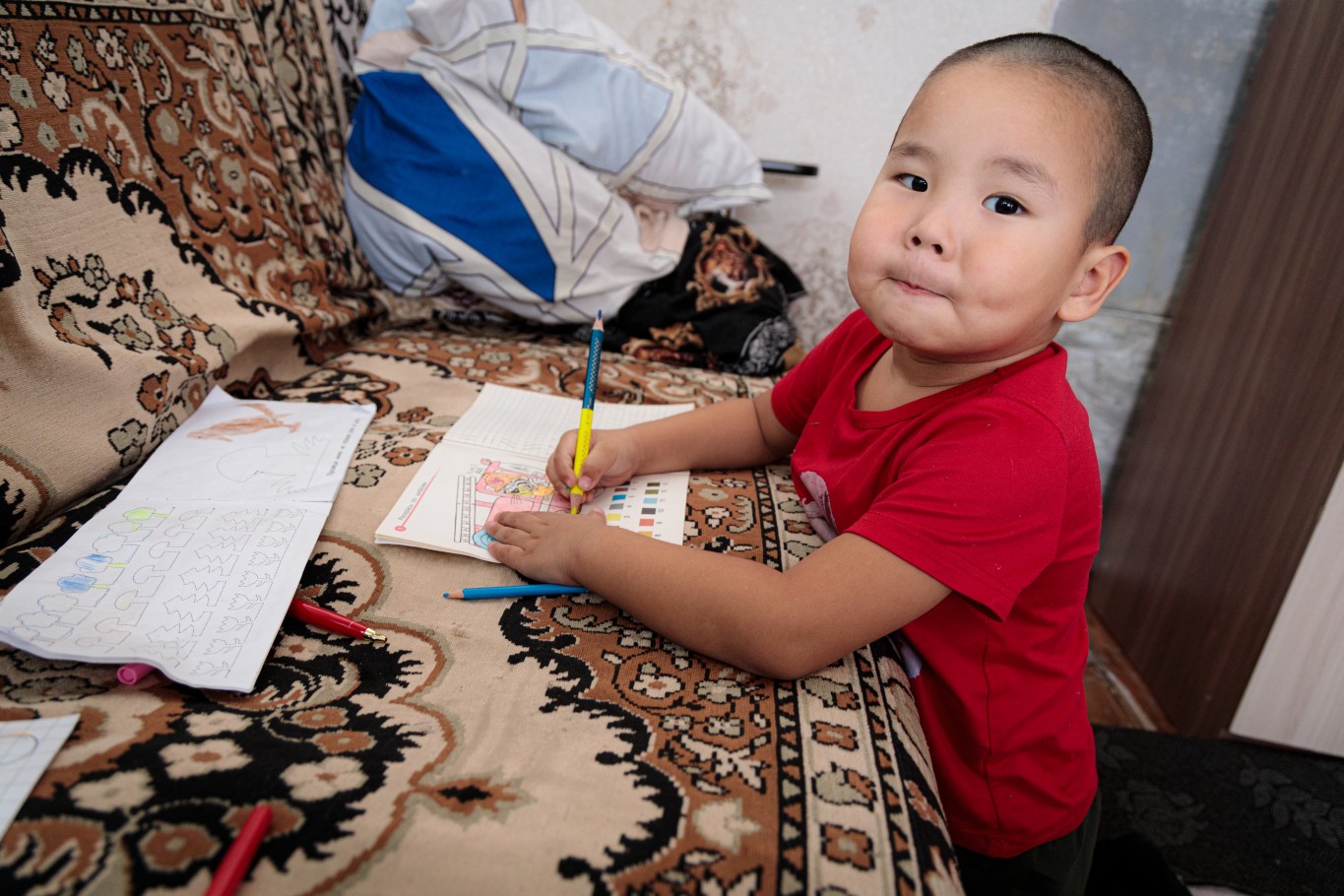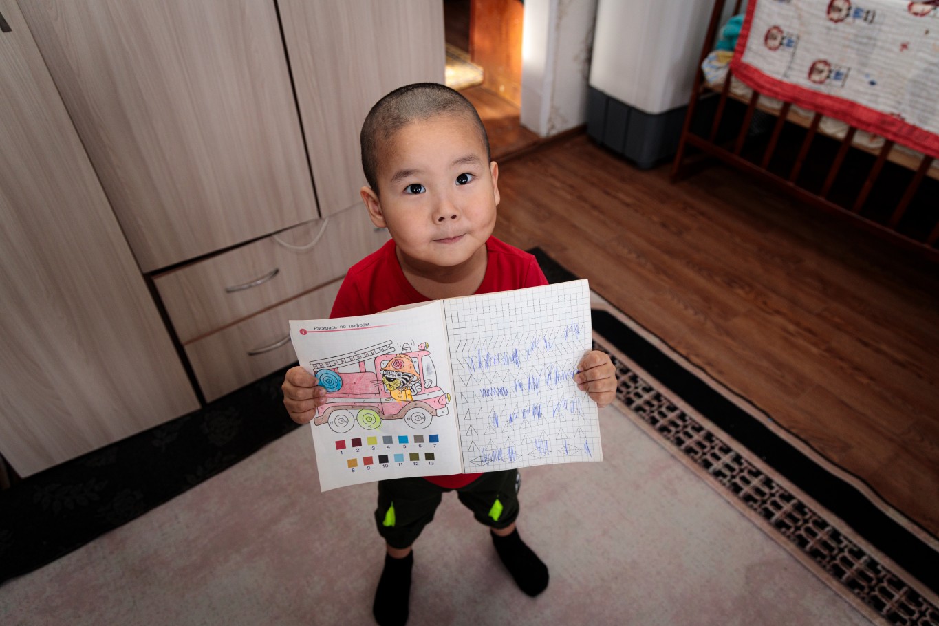 Малышки – Адия, Аиша и Асель спят поперек кроватки. Их братья здесь же, в комнате, играют. Младший – Тимур, ему скоро исполнится четыре года, что-то усердно рисует. Старшему Расулу 10 лет, он предупредил, что фотографироваться не будет, потому что не любит. Зато охотно познакомил нас со средним братом – Амиром и отметил, что тот младше его на целых два года.