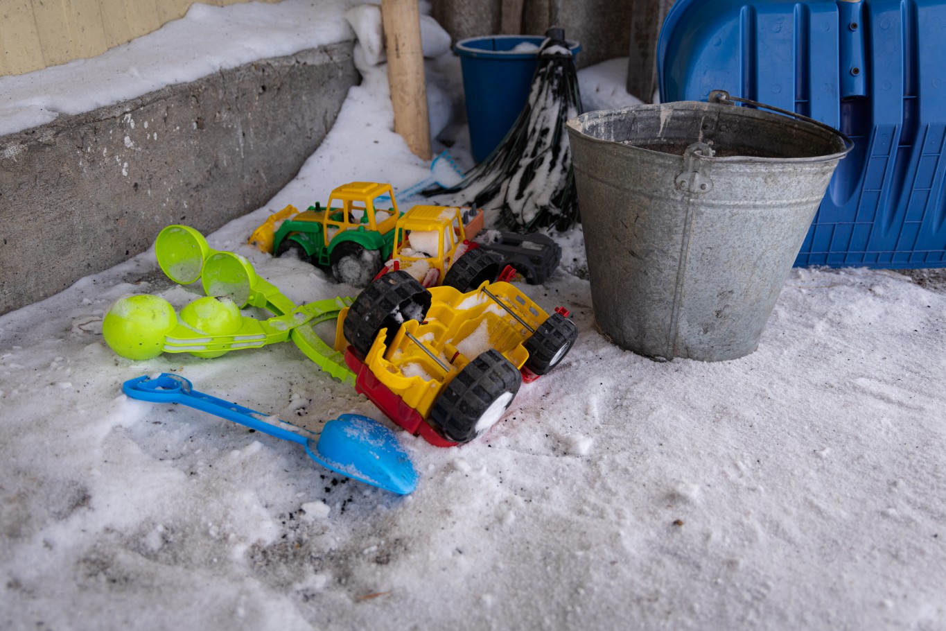 Во дворе большая лопата и много детских игрушек. Чтобы зайти в дом, пришлось немного пригнуться, так как очень низкий потолок.